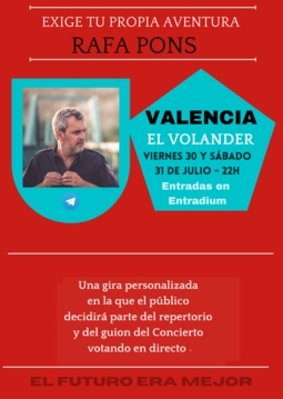 Rafa Pons vuelve a VALENCIA al querido VOLANDER y lo hace para estrenar su gira "Exige tu propia aventura" en la cual los asistentes podrán votar y tomar algunas decisiones sobre las canciones que Rafa cantará, así como de las anécdotas o sorpresas que tendrán lugar durante el concierto