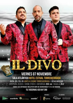Disfruta de una noche unica con los grandes exitos de un GRUPO inigualable , el mejor tributo a IL DIVO, nos visita con un repertorio espectacular celebrando los grandes exitos de esta leyenda viva de la cancion.Os esperamos