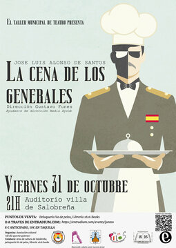 En abril de 1939, pocos días después del final de la guerra civil, Franco ofrece a sus generales una cena en el prestigioso Hotel Palace de Madrid. Para ello, hay que sacar de la cárcel a los antiguos cocineros (del bando republicano) y ponerlos a trabajar con los camareros (del bando nacional.) Aunque la obra está situada en el contexto de la posguerra, su autor: José Luis Alonso de Santos, nos presenta una deliciosa comedia que lleva al espectador de la sonrisa a la emoción, y a la reflexión sobre algunos valores básicos como el esfuerzo, la dignidad del ser humano y sobre todo, la ineludible necesidad de la reconciliación. En la obra, el teniente Medina, encargado de organizar el banquete, se vuelve loco para atender las exigencias del Maitre y de los cocineros que quieren estar a la altura de las circunstancias y ofrecer el mejor banquete de sus vidas. Lo hacen por orgullo y por amor propio, con la moral alta y con el único propósito de sentirse dignos. El Taller Municipal de teatro, presenta su versión haciendo énfasis en el tono cómico y anecdótico de la obra, con la única pretensión de entretener y divertir al espectador. Si hay alguna reflexión en nuestra propuesta escénica, es la de trabajar juntos por el futuro de las generaciones venideras.