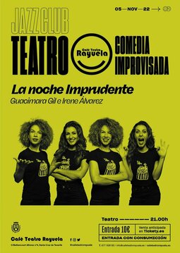 “La Noche Imprudente” está protagonizada por Guacimara Gil e Irene Álvarez. Un espectáculo teatral basado en juegos de improvisación. Durante una hora y media, crearán historias breves inspiradas en los títulos, sugerencias o frases que piden al público al inicio del espectáculo. Las actrices durante toda la función se transformarán en todo tipo de personajes que hablarán con un texto creado al instante, sin guión previo. Ofrecen comedia fresca donde la trama se construye en el momento presente haciendo que la representación sea única. Humor, diversión, juego y teatro son las bases de un espectáculo que si lo ves, repites!
