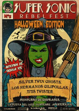 Viernes 31 de Octubre. SUPER SONIC REBEL FEST, Halloween edition : SILVER  + TWIN GHOST + LOS HERMANOS GILIPOLLAS + TITIS TWISTER. Hora: 19:30. Entrada anticipada: 8 €. Entrada taquilla: 10 €. Entradas a la venta en La Cueva del Jazz en Vivo (Calle Puerta Nueva 30 Bajo - Zamora) y en Entradium.