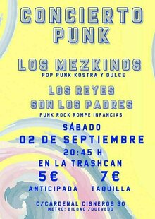 Concierto Punk de Los Mezkinos (Pop Punk kostrero y dulce) y Los Reyes Son Los Padres (Punk Rock rompe infancias) el día 2 de septiembre en la sala Trashcan (Calle Cardenal Cisneros Nº 30). Apertura de puertas a las 20:45.