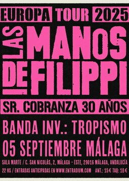 La banda argentina Las Manos de Filippi celebra los 30 de su mayor exito Sr.Cobranza en una gira internacional que incluye varios paises de Latinoamerica y Europa.