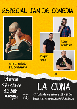Vuelve el ESPECIAL JAM DE COMEDIA a LA CUNA de Elche!!!! Probando nuevo material tendremos a Lionel Mandrake, Joaquín Ponce y Juli. Cómo novedad tendremos a EDU SANTAMARÍA desde COMEDY CENTRAL!!!! Risas aseguradas!!! Saca tu entrada!!!!