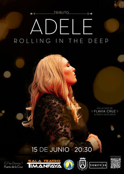Adele - Rolling in the Deep (Tributo), en la Sala Teatro TimanfayaExperimenta en vivo todos los grandes éxitos de la gran artista británica con este maravilloso tributo. Este evento cuenta con la impresionante voz de Flavia Cruz, una fantástica banda musical, enormes juegos de luces y atractivos fondos audiovisuales. Una oportunidad única para fans de Adele y apasionados de la música.